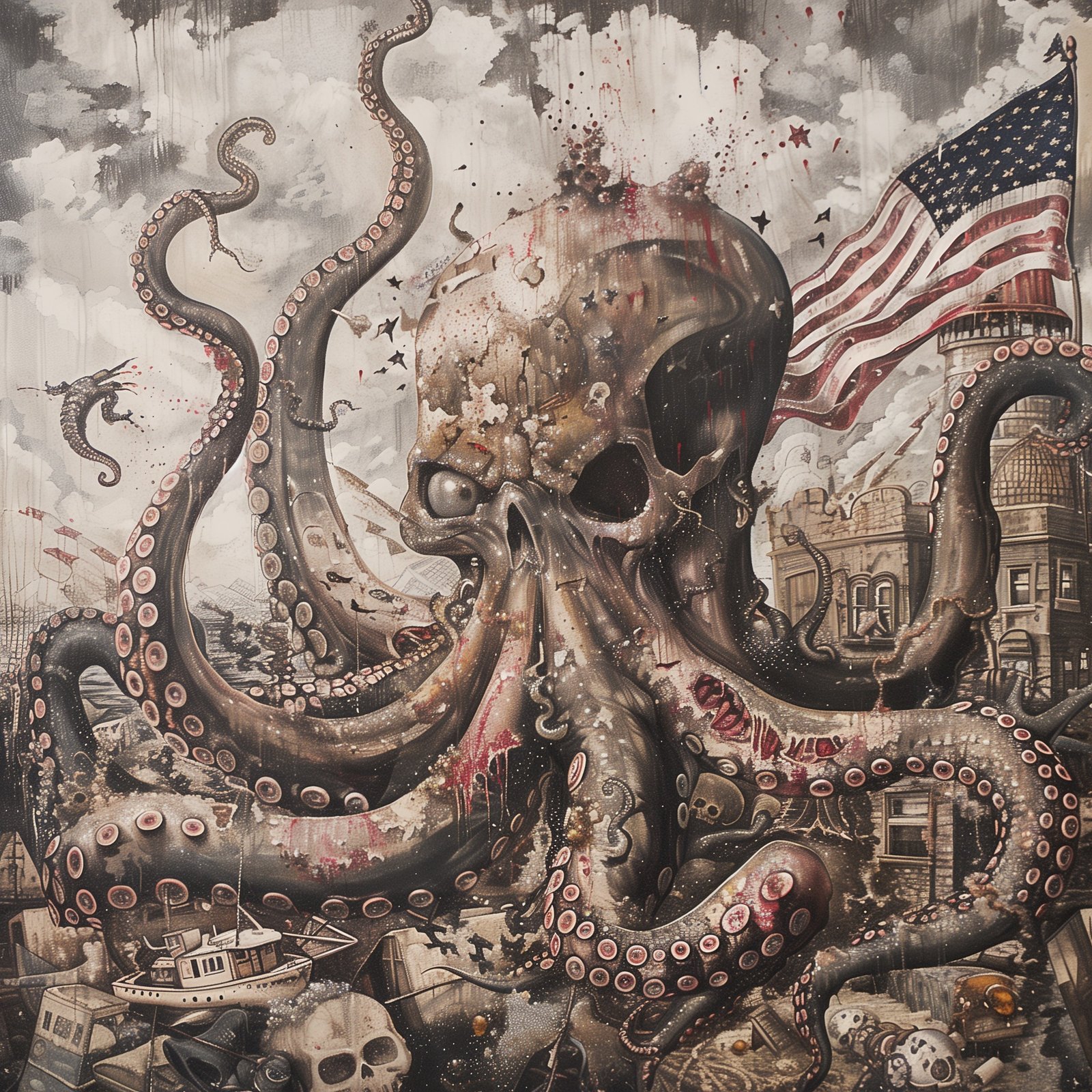 “An artwork that captures the dark, tangled forces lurking beneath the surface. The octopus symbolizes power, mystery, and the grip of unseen influences. A haunting piece that speaks to both history and rebellion. 🌊🦑🇺🇸