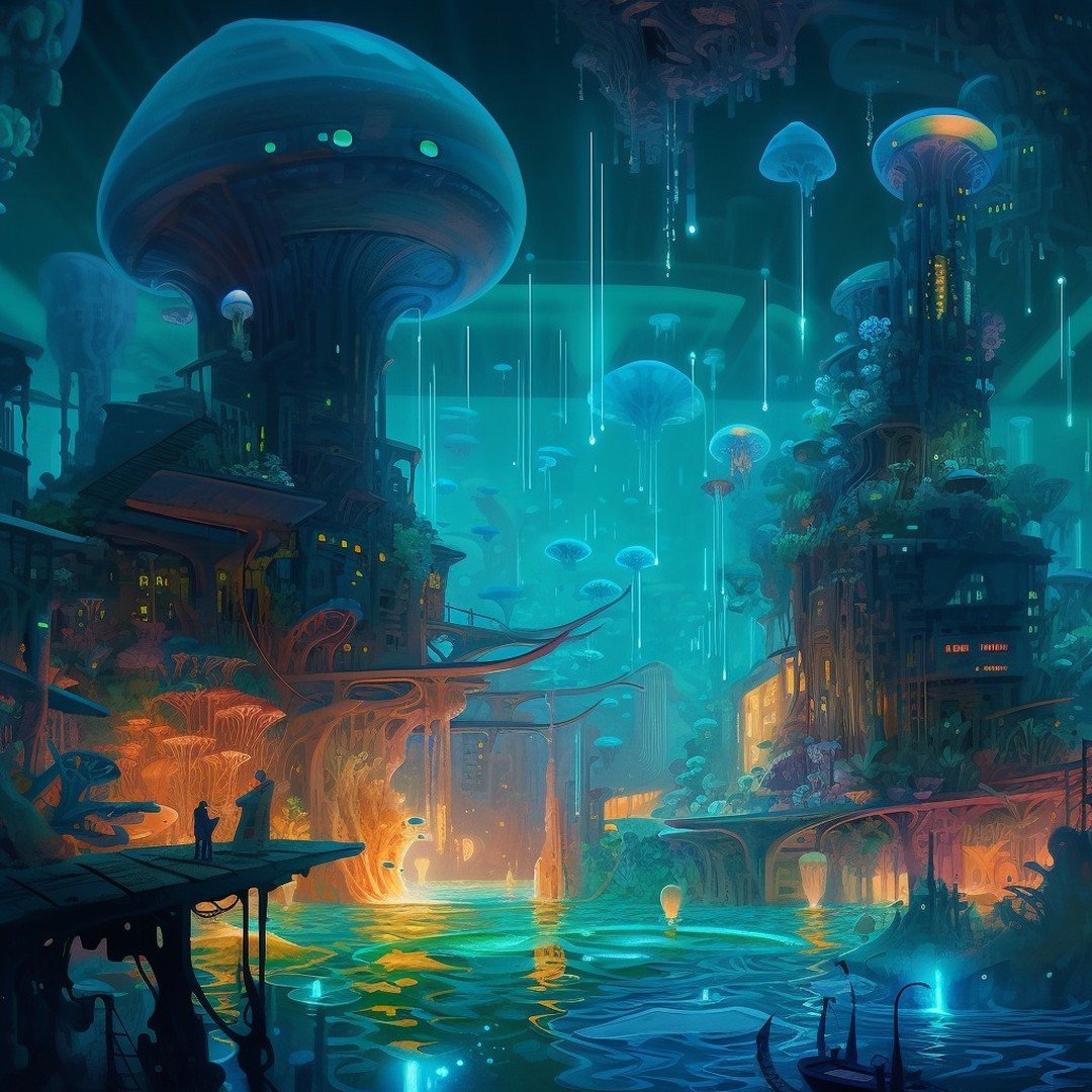 Check out this epic artwork of a futuristic city covered in mushroom clouds! 😍🌇 Created in the stunning style of neon art nouveau, with intricate underwater worlds and a luminescent color scheme. 😎