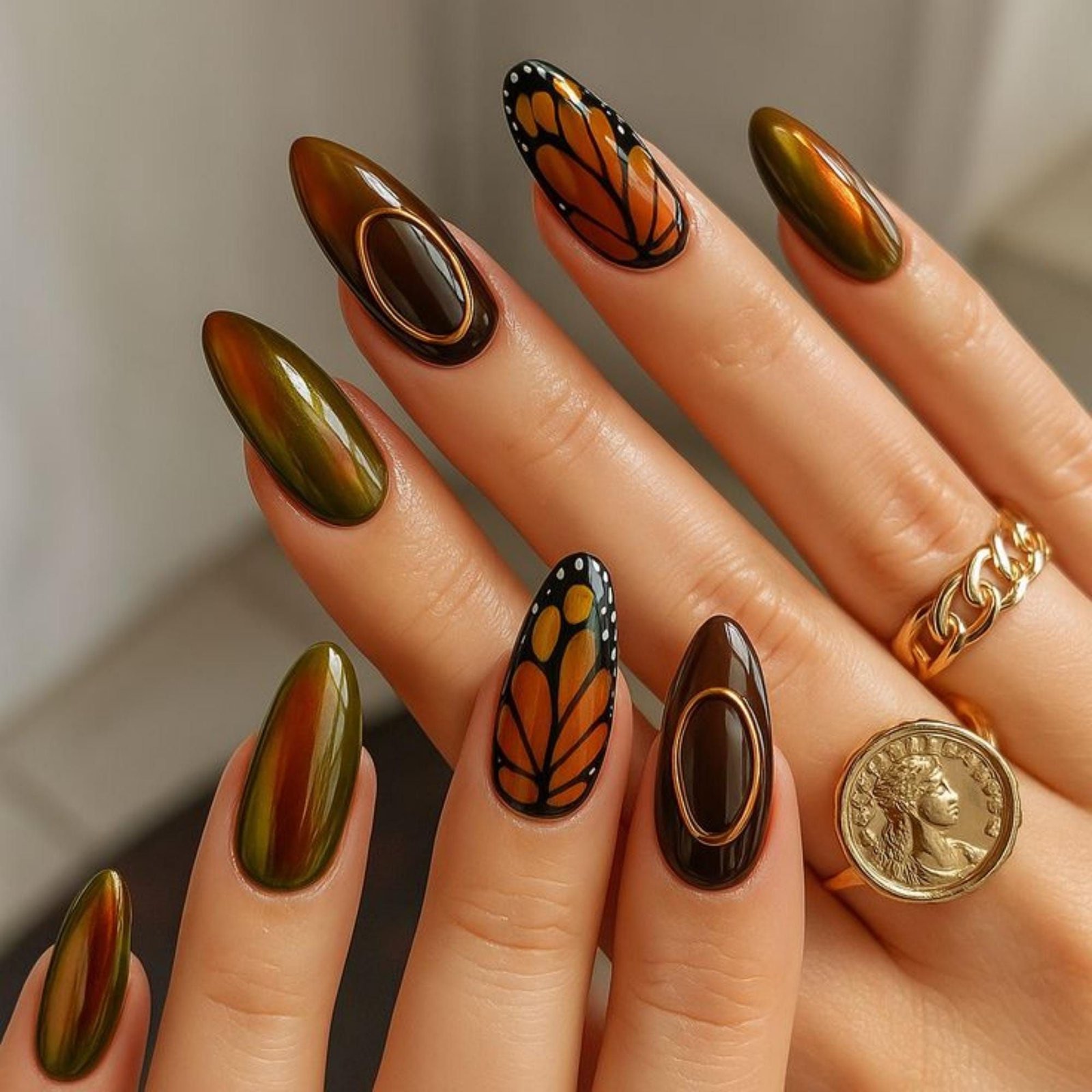 View Full Post Fall FashionMonarch Butterfly Press On Nails, Fall Olive Brown Nails, Long Oval Nail Art, Handmade Nature Nails, Autumn Butterfly Design Fake Nails