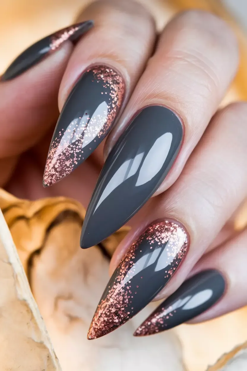 View Full Post Fall FashionTrendy Fall & Winter Nail 2025–2026: Smoky Charcoal with Rose Gold Glitter