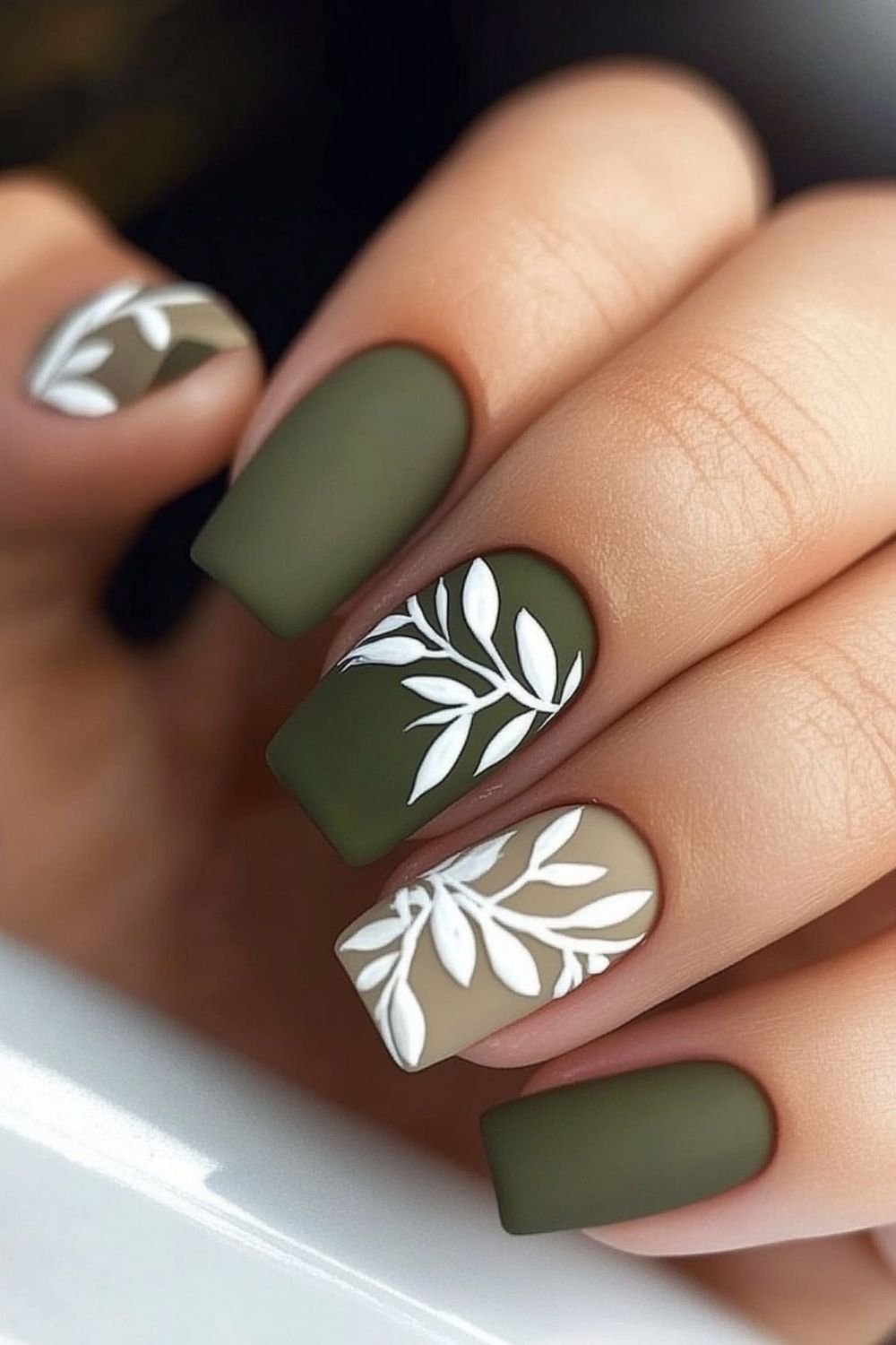 View Full Post Fall FashionGet Inspired by 58 Stunning Fall Nail Designs: Olive Green and Beige Nails with White Leaf Art