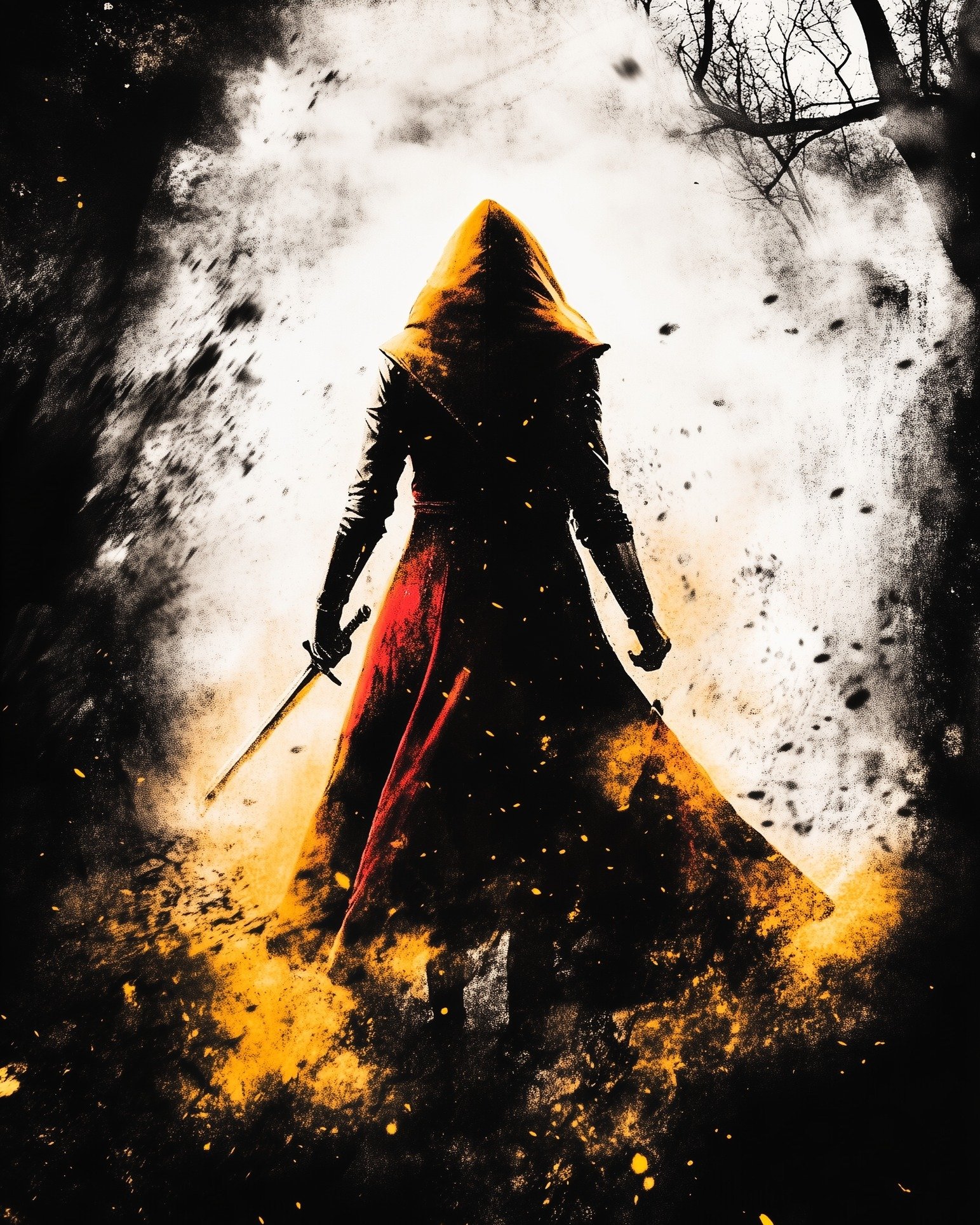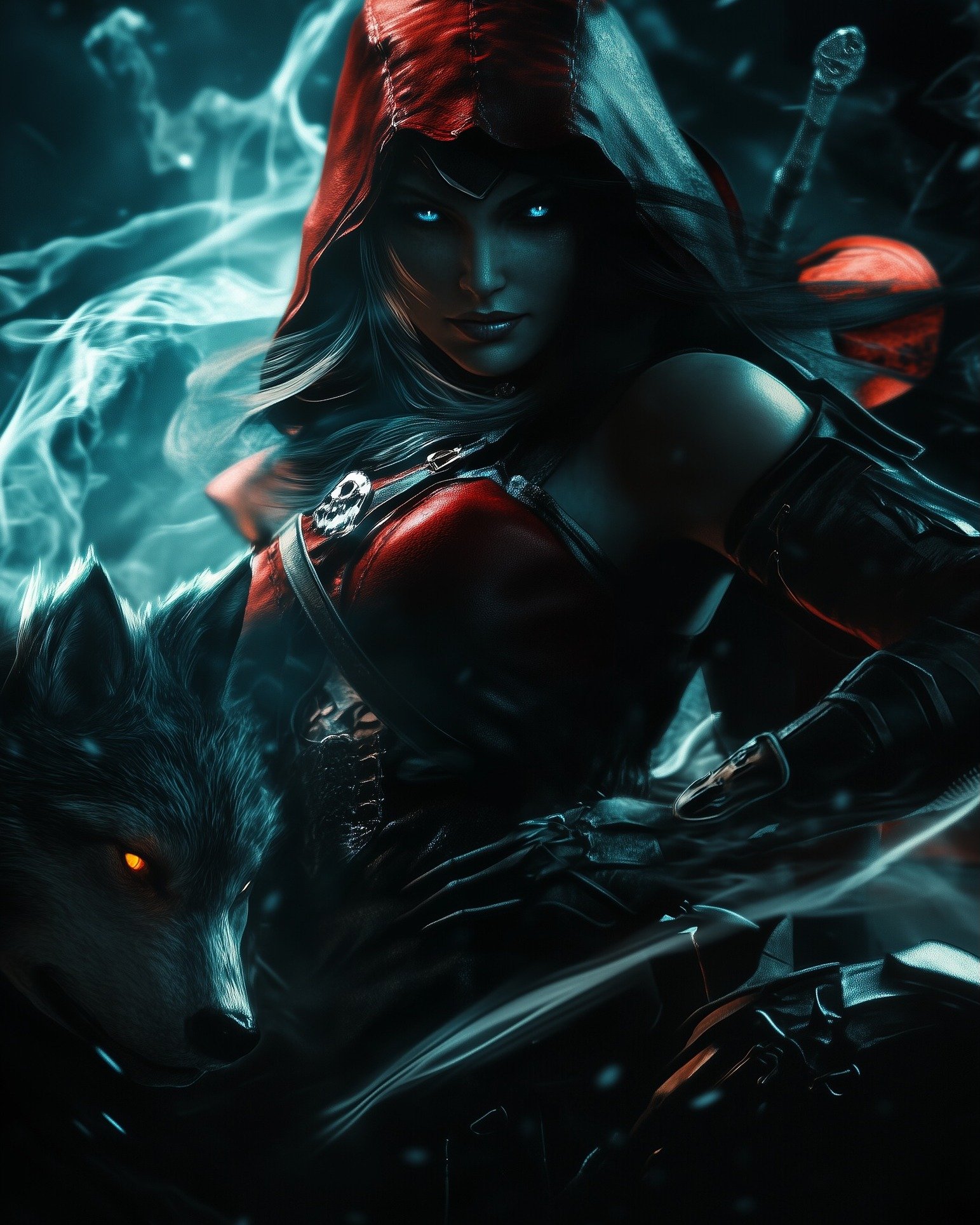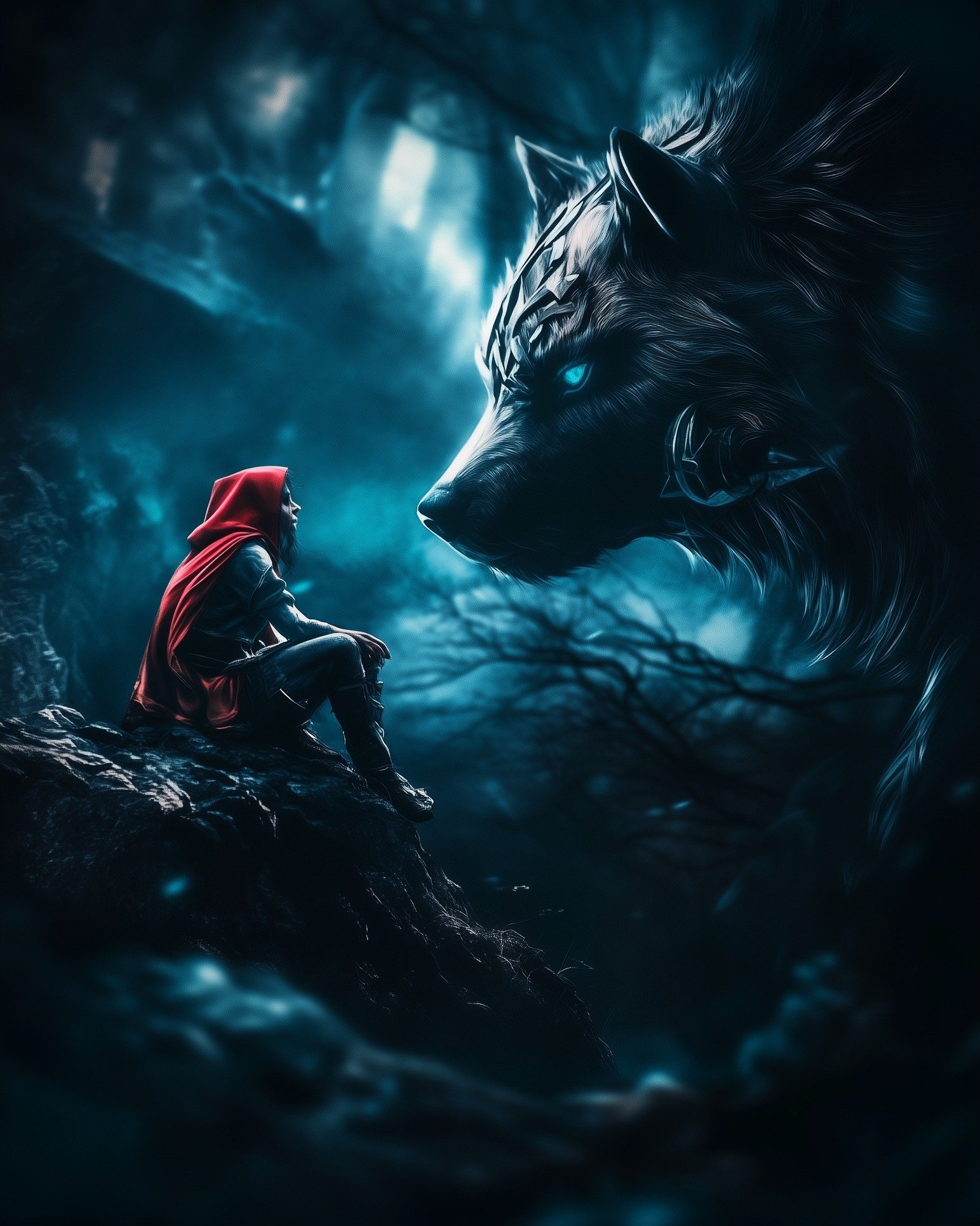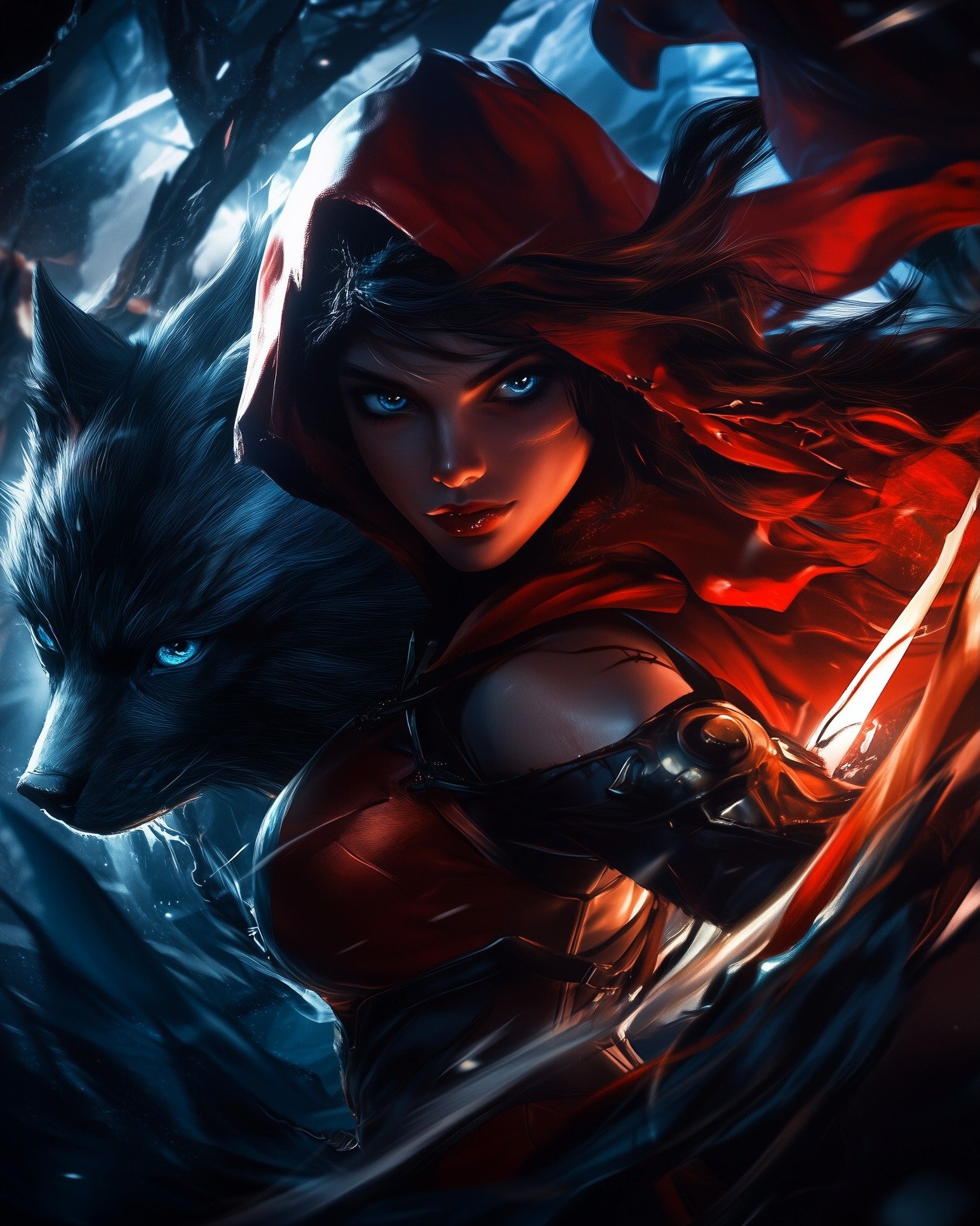 Now, the villagers speak of her in hushed whispers. They say she walks the forest paths like a phantom, her eyes glinting with a feral blue light, her blade gleaming with the Wolf’s sigil. The innocent child who once carried a basket of sweets now carries a sword etched with runes of the hunt – each strike a reminder that prey can become predator.