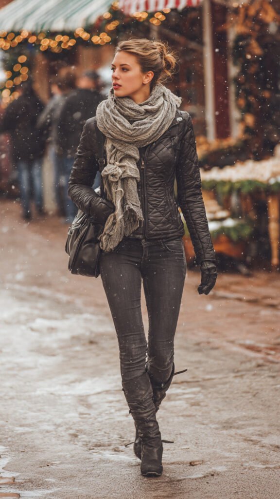 A fitted leather jacket, black trousers, and statement heels are perfect for a night out in the city. Add a bold scarf and a sleek handbag for a chic finish.