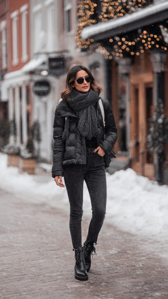 A white quilted jacket, dark wash jeans, and ankle boots are a match made in heaven. Add a luxurious cashmere scarf and a chic mini backpack for a sophisticated look.